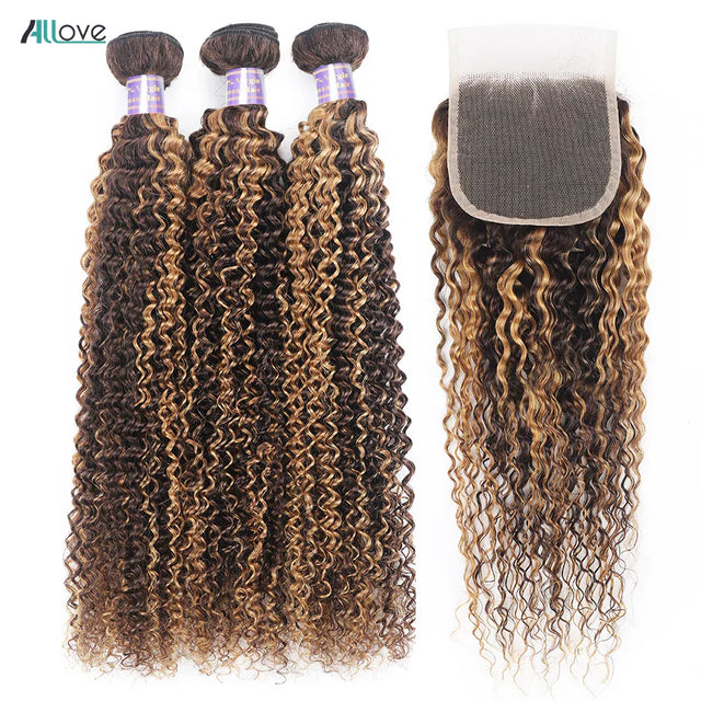 P4/27 Highlight Curly Hair Bundles With Closure 4x4 Transparent Lace Closure With Bundles Brazilian Ombre Honey Blonde Bundles