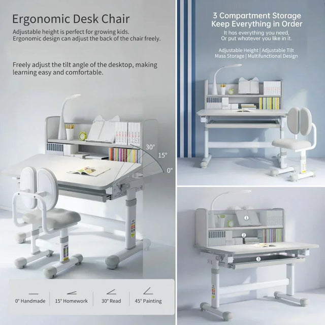 Kids Desk and Chair Set Height Adjustable, Children Study Table with Tilt Desktop, School Functional Writing Desk with Drawers
