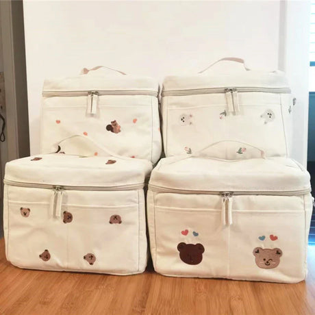 Cute Bear Flower Embroidery Pattern Baby Beige Cotton Fabric Zipper Diaper Handbag New Luggage Bag