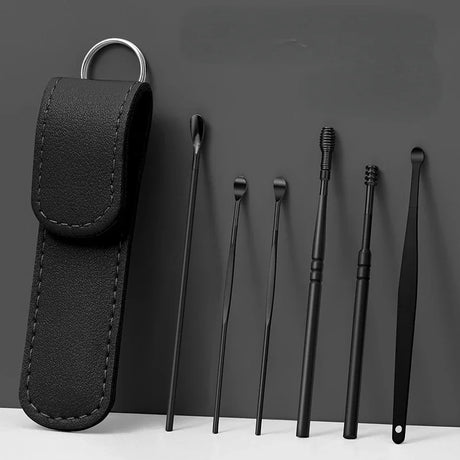 Stainless Steel Earpick Storage Leather Cover 6 Piece Set Spiral Earwax Cleaner