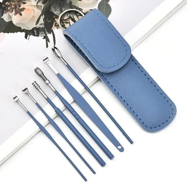 Stainless Steel Earpick Storage Leather Cover 6 Piece Set Spiral Earwax Cleaner